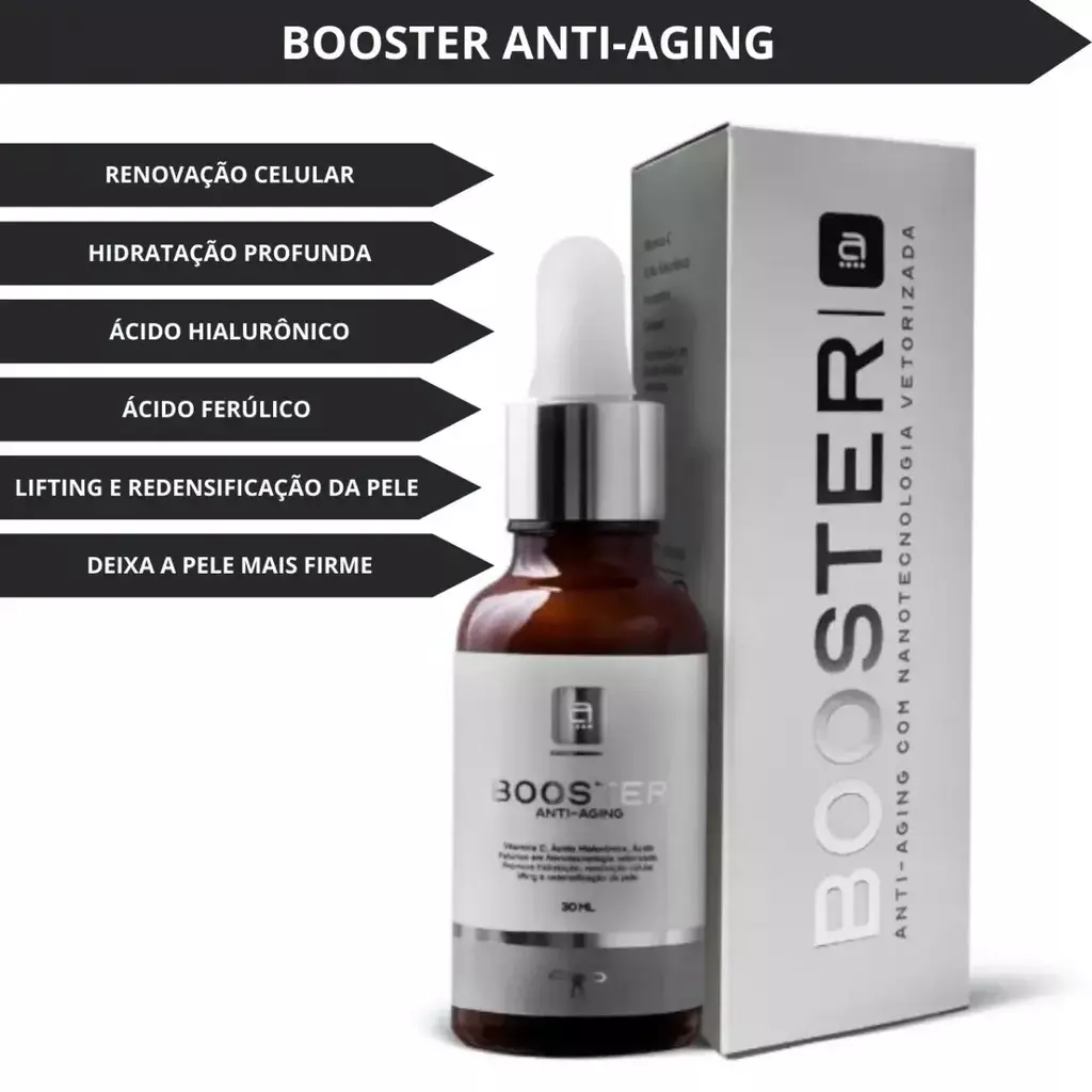O Booster Anti-Aging é um sérum facial concentrado que purifica, acalma e reduz a aparência das linhas de expressão e rugas, proporcionando maciez e luminosidade. Formulado com ativos antioxidantes nanoencapsulados como Vitamina C, Resveratrol, Ácido Hialurônico, Colágeno e Ácido Ferúlico, garante maior penetração nas camadas da pele, oferecendo resultados intensos e visíveis.