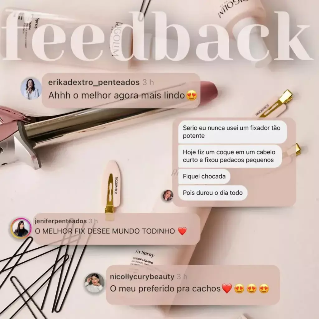 Modo de uso: Para fazer escova com volume borrife na raiz dos cabelos úmidos ou secos e escove. Para a fixação de cachos e ondas borrife no cabelo seco camada por camada (fixação forte) ou mecha a mecha (fixação extra forte) e modele com o modelador de sua preferência. Para finalizar borrife no penteado ou técnica pronta e sele os fios com o cabo do pente.