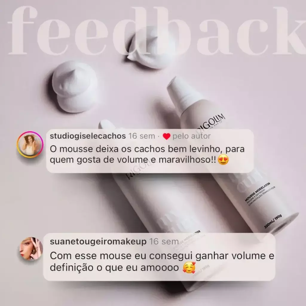 É um mousse de textura leve que define e reduz o frizz sem perder o volume do cabelo. Sua fórmula é enriquecida com Óleo de Argan e D-pantenol, que promovem o controle da retenção da água na fibra capilar, proporcionando cabelos hidratados e com aspecto saudável. Indicado para cabelos lisos, ondulados, cacheados, crespos e em transição. Não contém sulfato, óleo mineral, petrolatos e sal.
