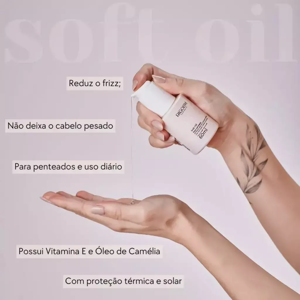 O SOFT OIL Rigolim Hair and Co é um óleo de antifrizz que pode ser utilizado para fazer penteados e também para uso diário nos cabelos secos ou úmidos. Proporciona ação antifrizz, brilho, facilita o desembaraço, possui proteção térmica e solar. Não contém óleo mineral, parabenos, gluten e possui secagem rápida. Pode ser usado em todos os tipos de cabelos. Contém óleo de Camélia + vitamina E.